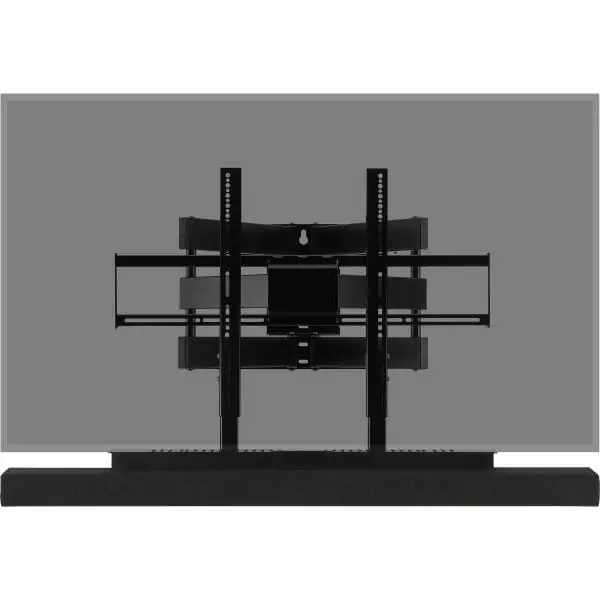 Holds a TV and the soundbar, allowing both units to easily rotate to face the viewer, then be pushed back against the wall when not in use.